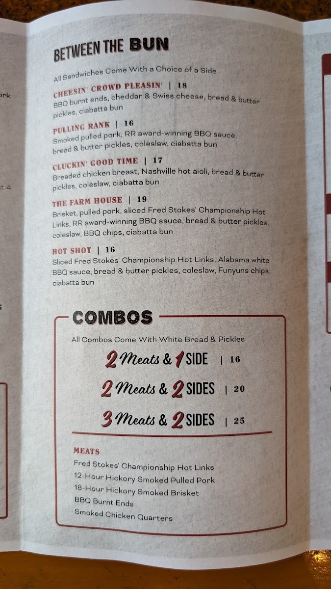 Brisket, pulled pork, sliced Fred Stokes' Championship Hot Links, RR award-winning BBQ sauce, bread & butter pickles, coleslaw, BBQ chips, ciabatta bun